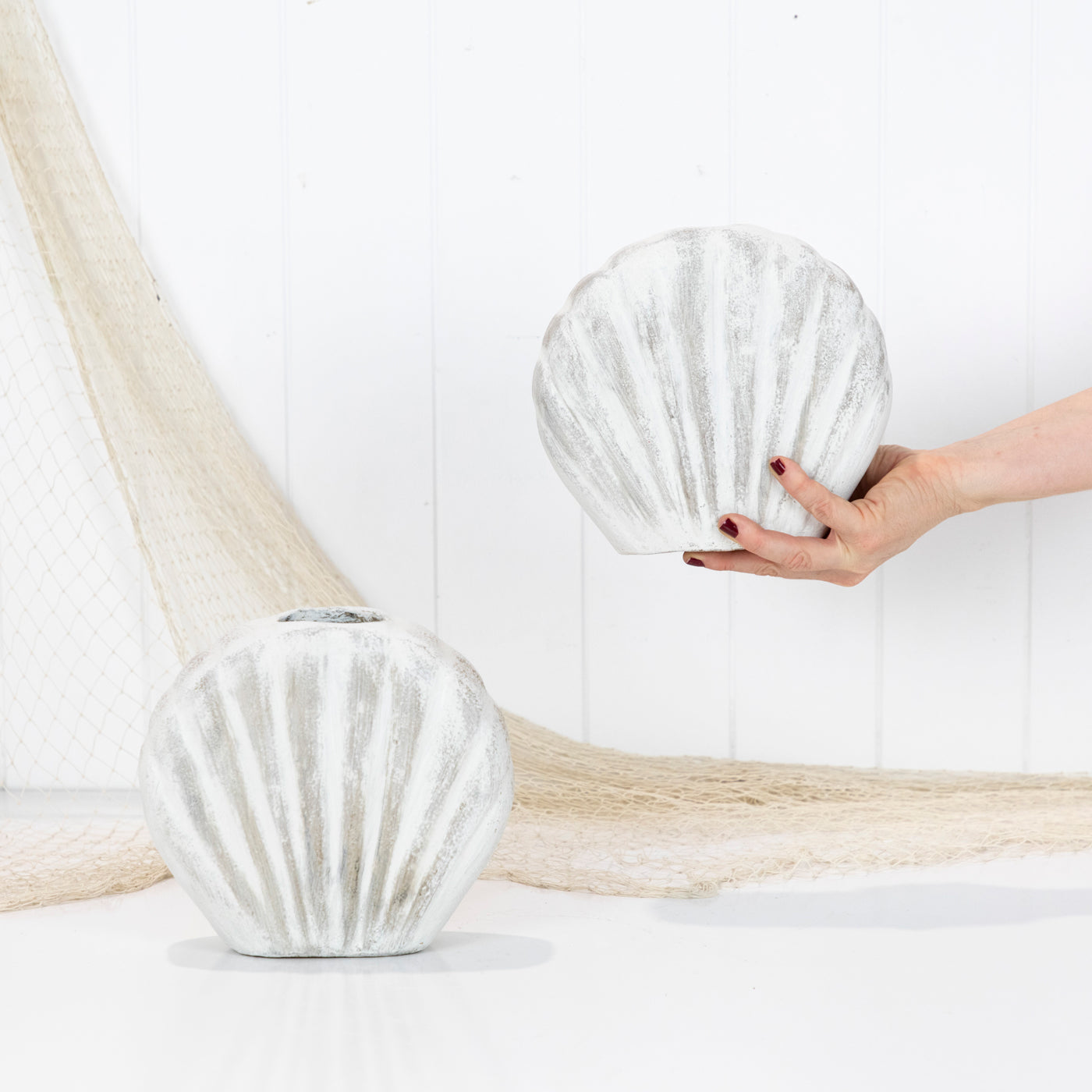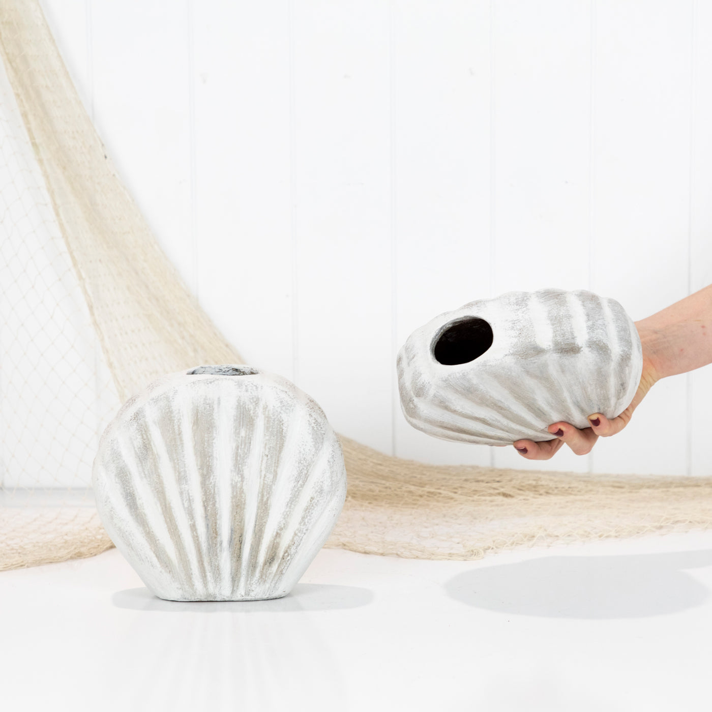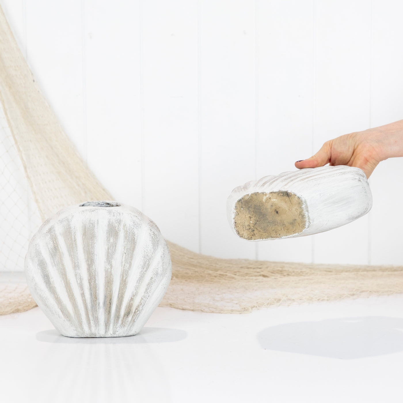 Shaped to resemble a scallop shell the terracotta toned clay has been given a chalky whitewash, sanded back in places to highlight the detailed design.