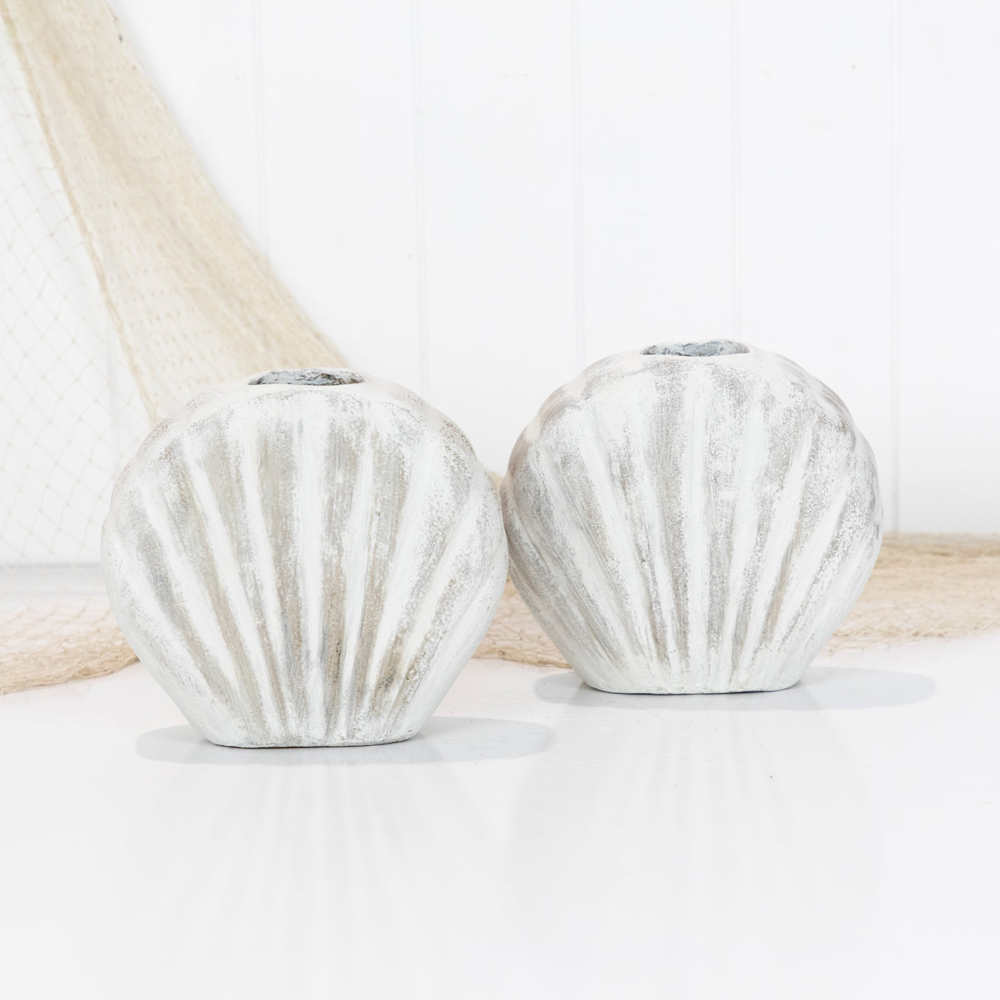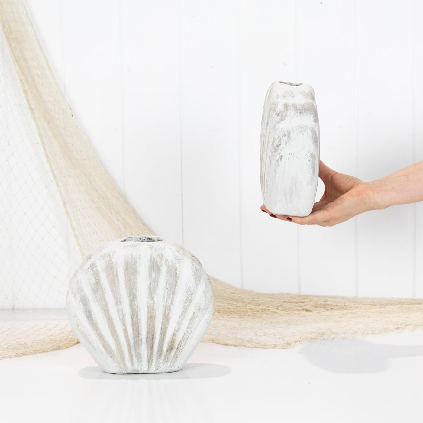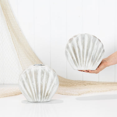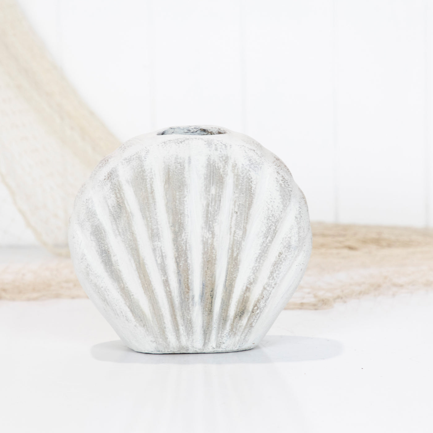 Shaped to resemble a scallop shell the terracotta toned clay has been given a chalky whitewash, sanded back in places to highlight the detailed design.