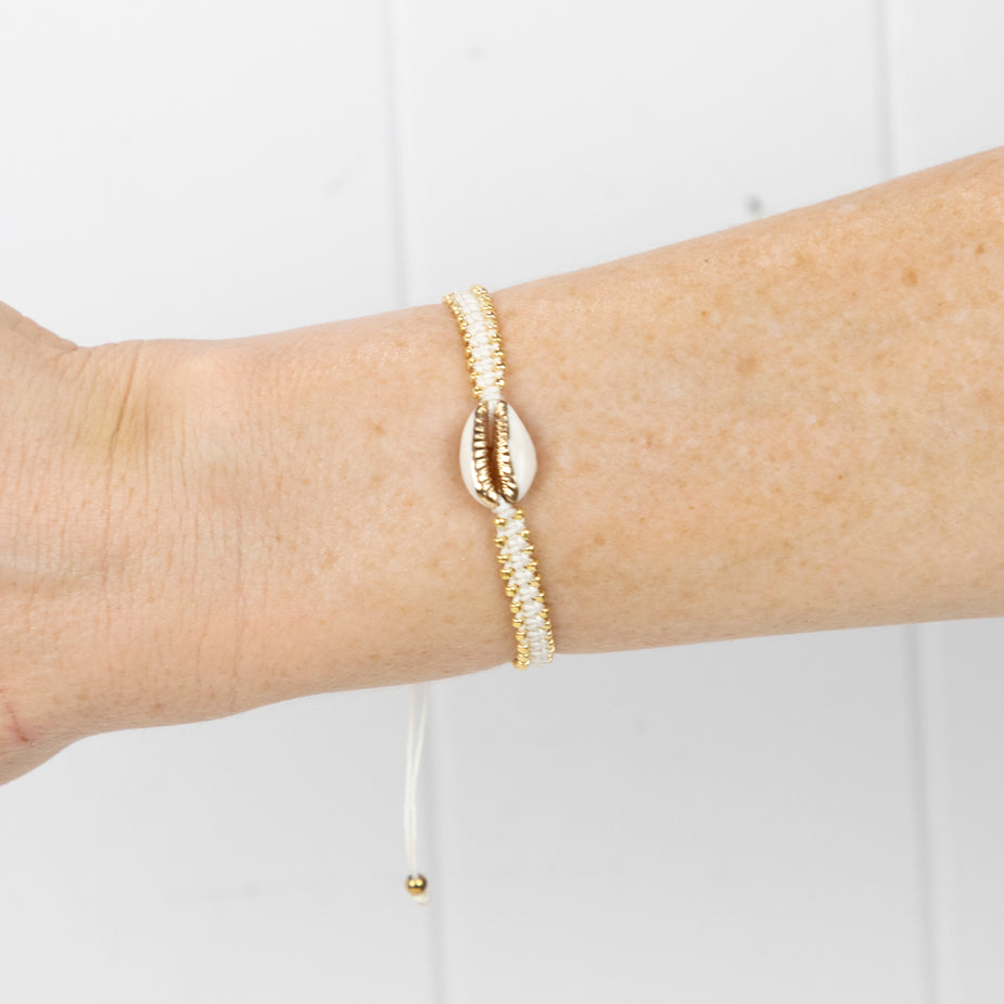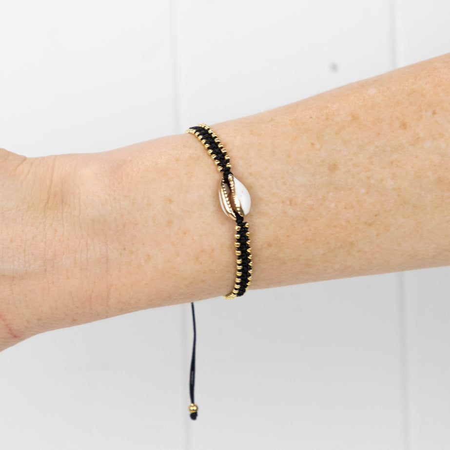 This bracelet features a gold dipped cowrie shells, hand braided with cord and golden feature beads.