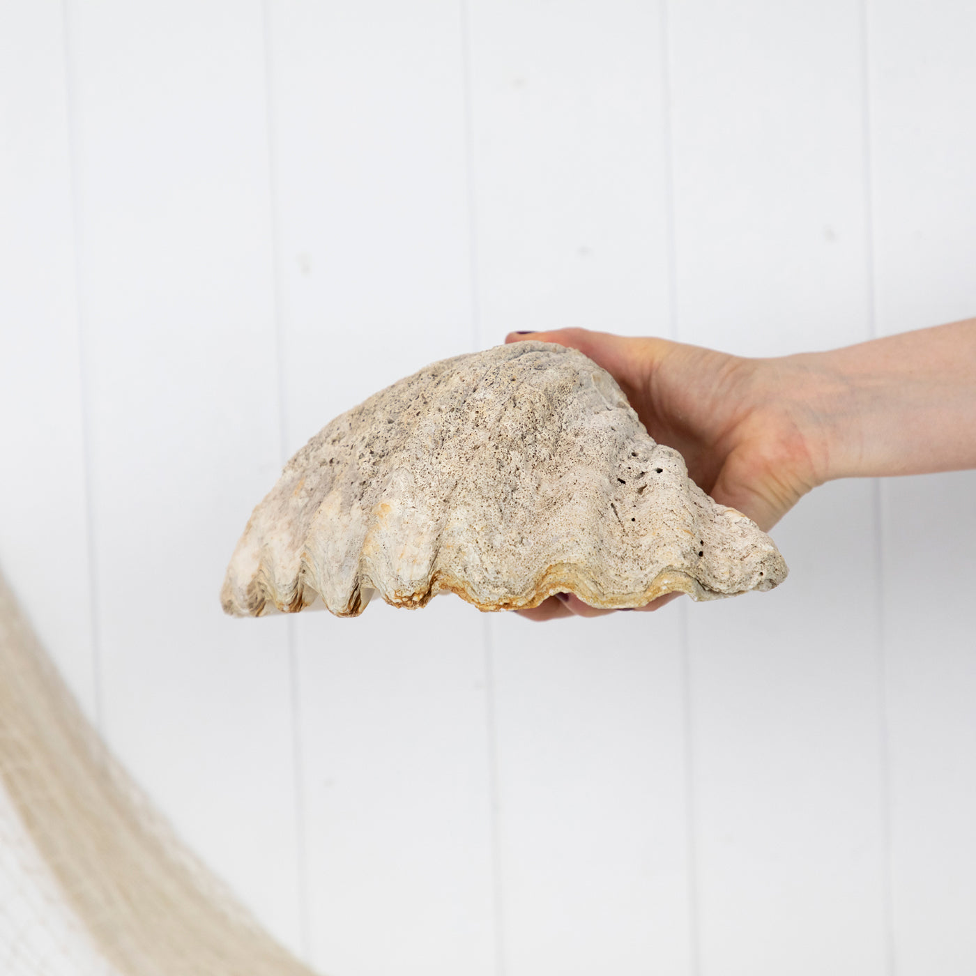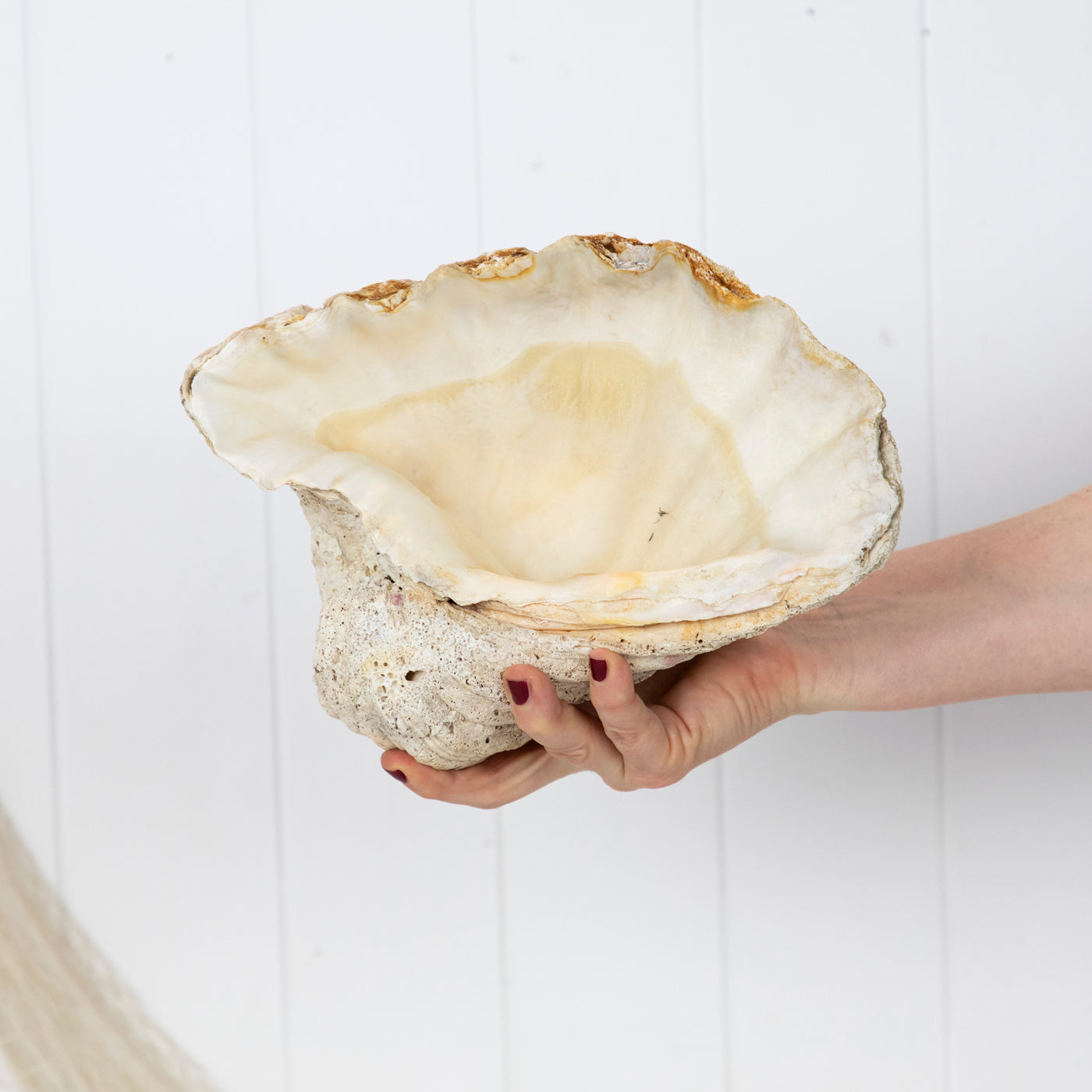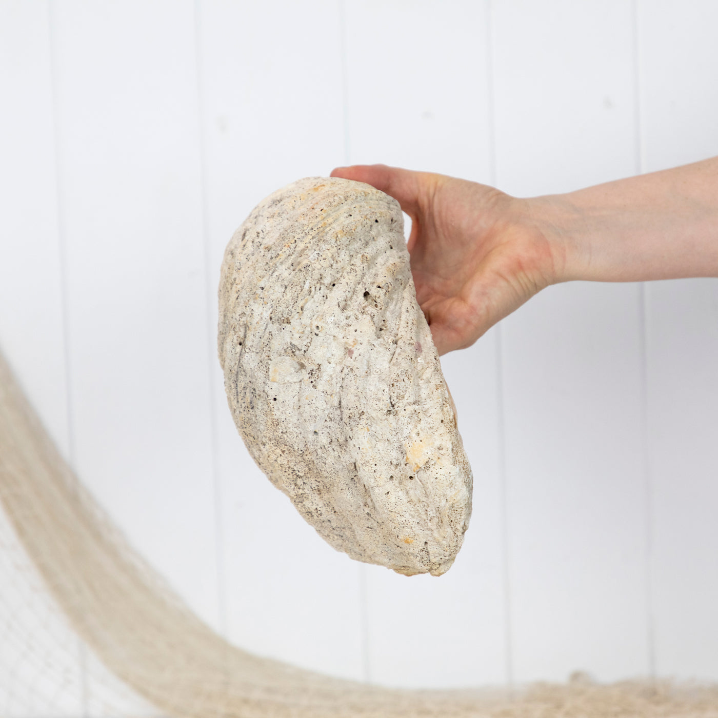 Faded with age it is pitted and grey on the outside with a creamy coloured inside.