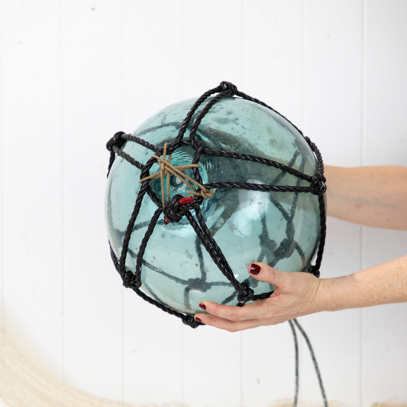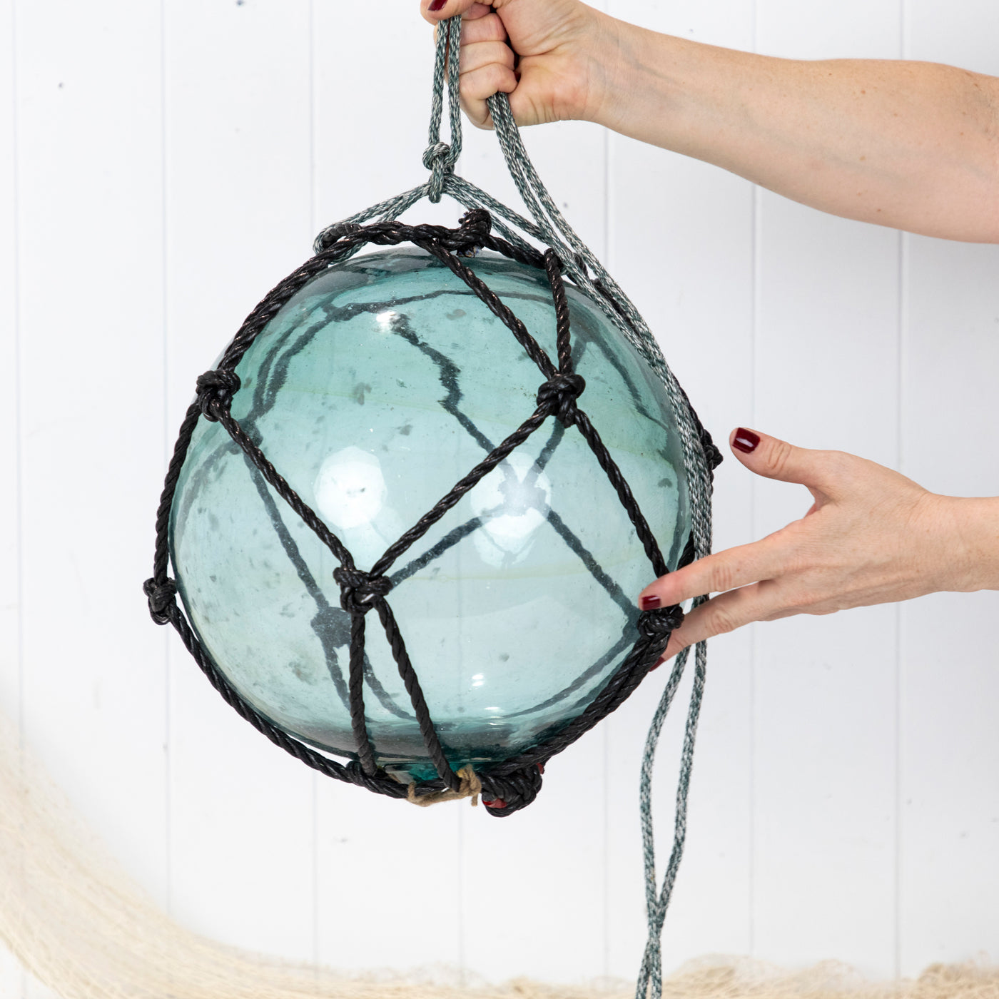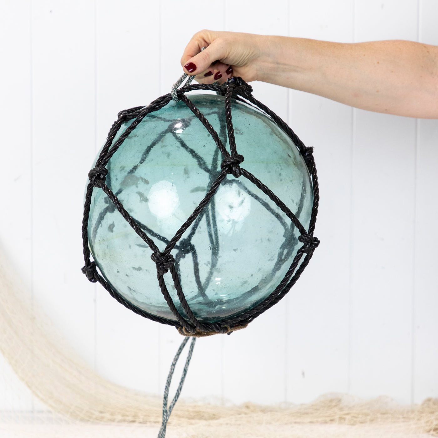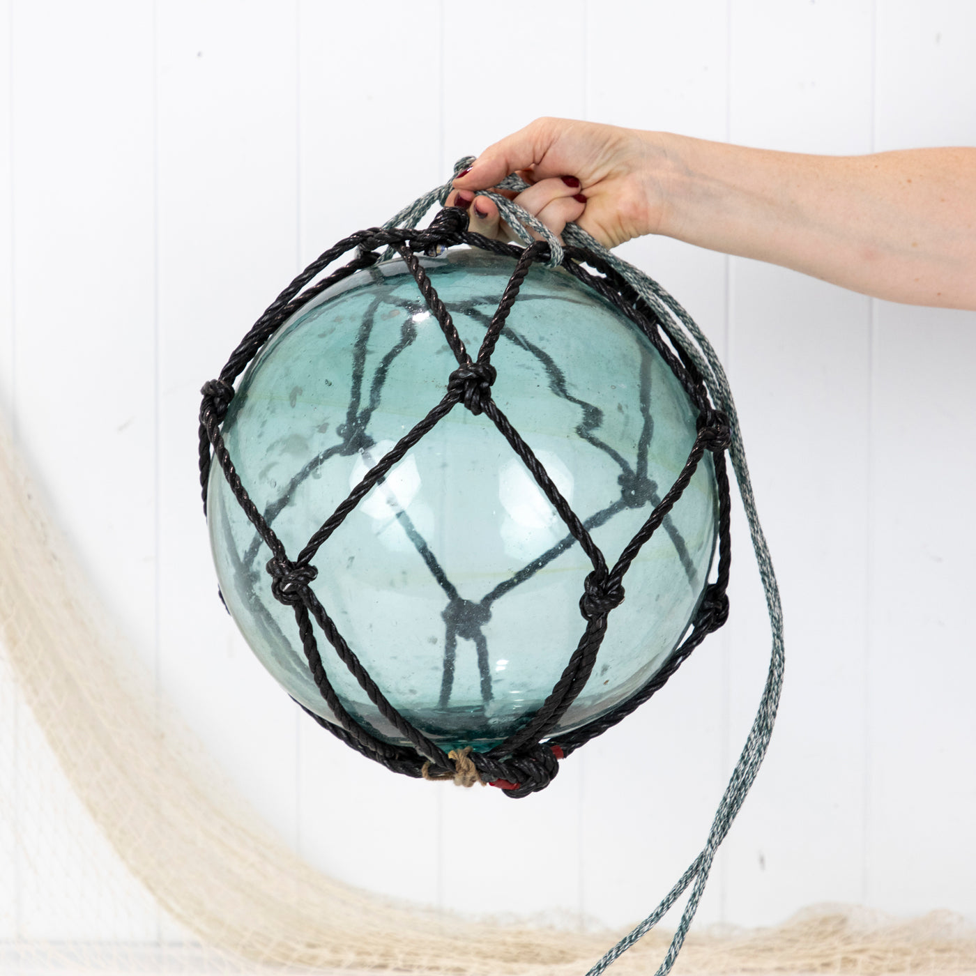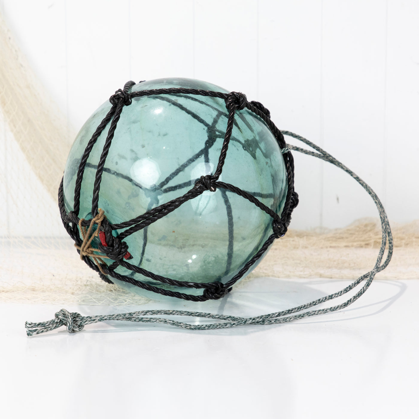 This beautiful old 12" glass float has black net.