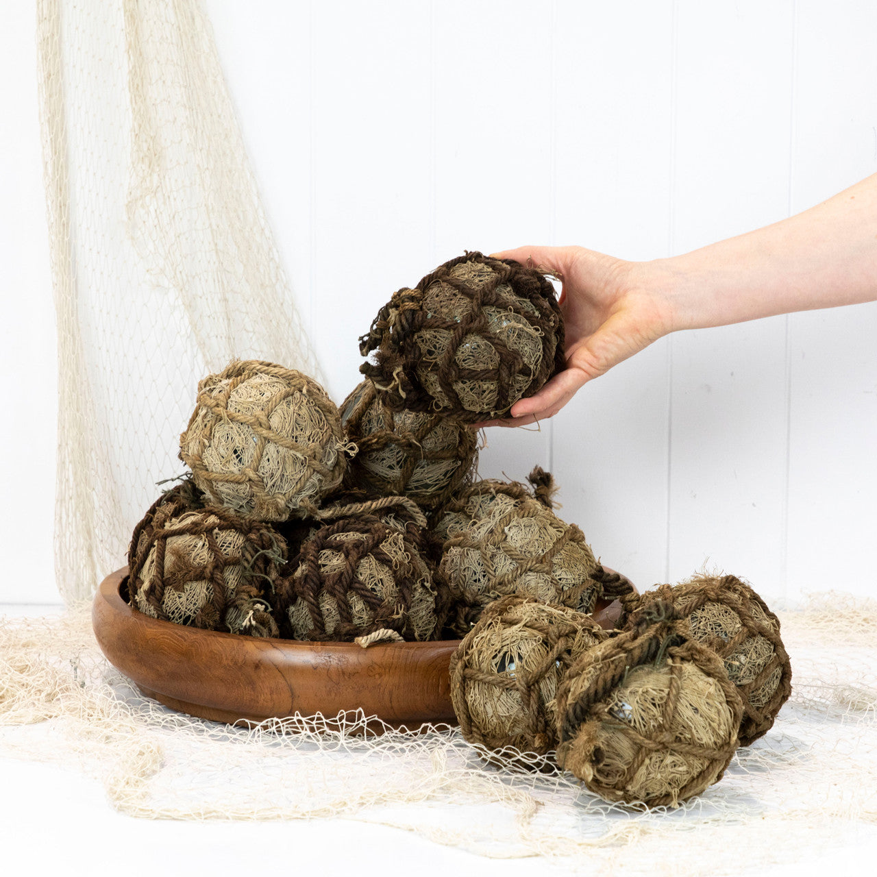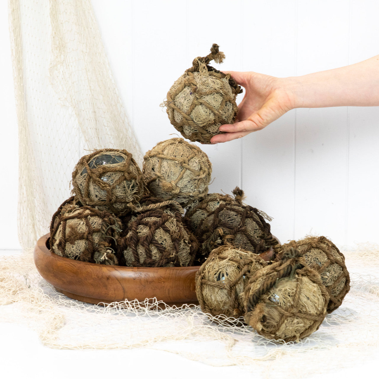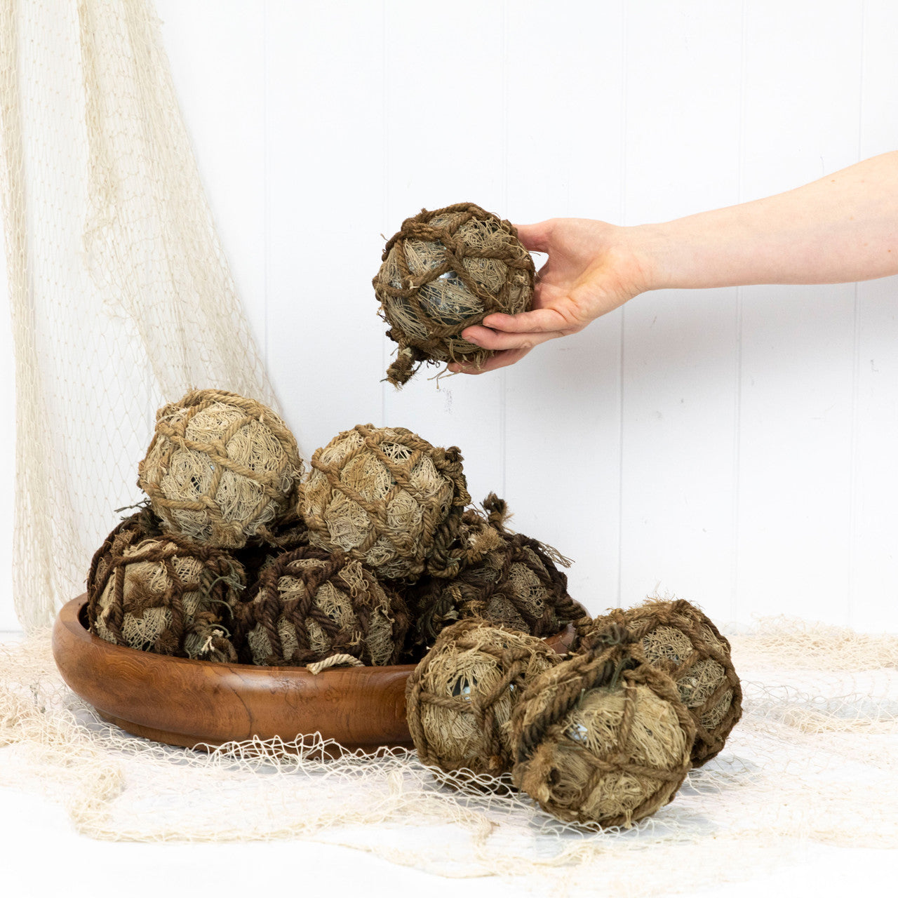 Each old 4"glass float has been wrapped in cotton fishing net, before a jute rope has been knotted over the top to hold it in place.