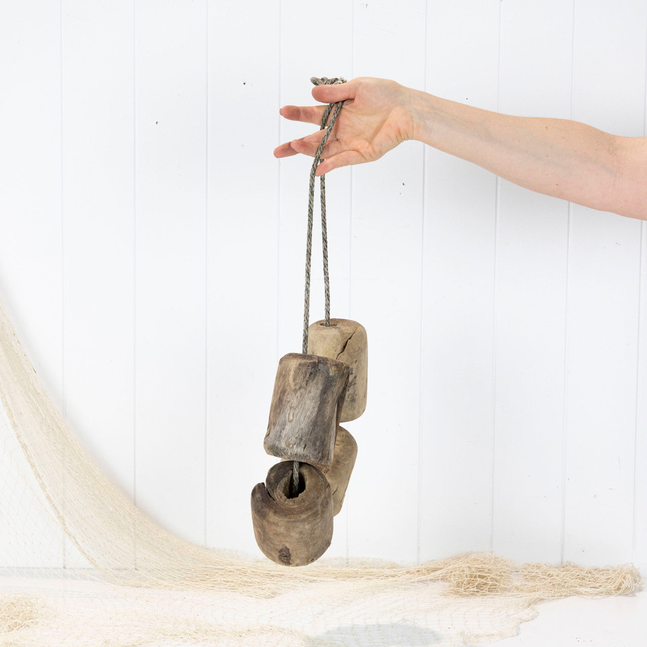 This piece of rope is filled with Japanese wooden floats that were once used on the edge of a fishing net.