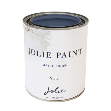 Jolie Paint in SLATE is a gorgeous, dark, subdued blue with greyish undertones. This colour works great with Traditional, Coastal or European style interiors, as well as Industrial.