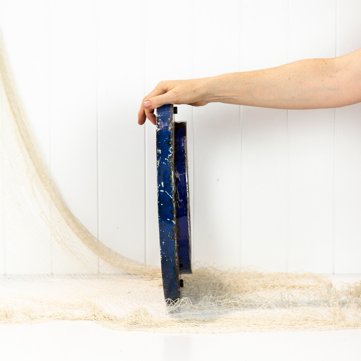 Due to the repurposed materials it has a wonderful texture and patina, each mirror  is slightly individual and may have text, but equally beautiful. More rust may form over time.