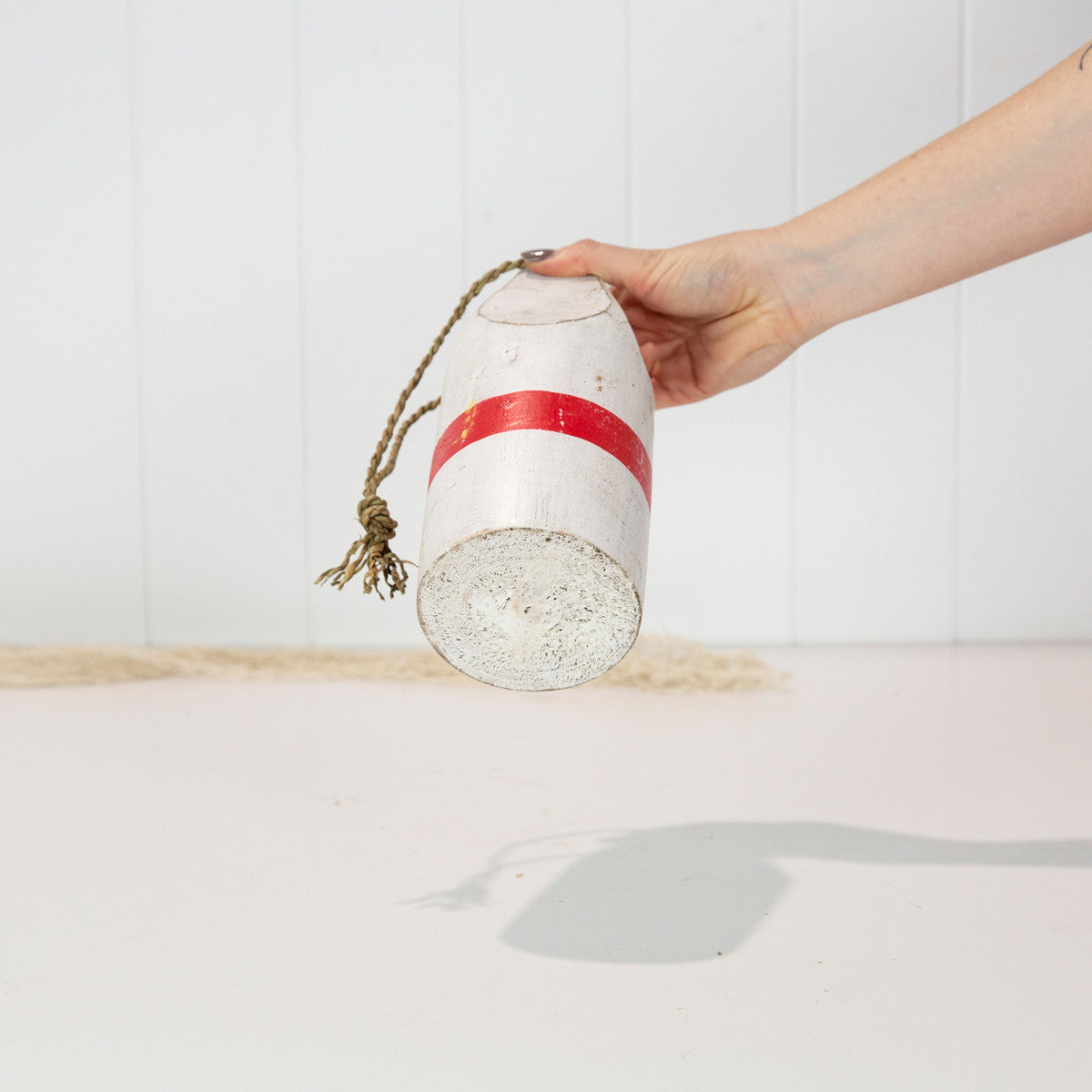 Painted white with a red stripe, the top of the buoy has been carved to a point.