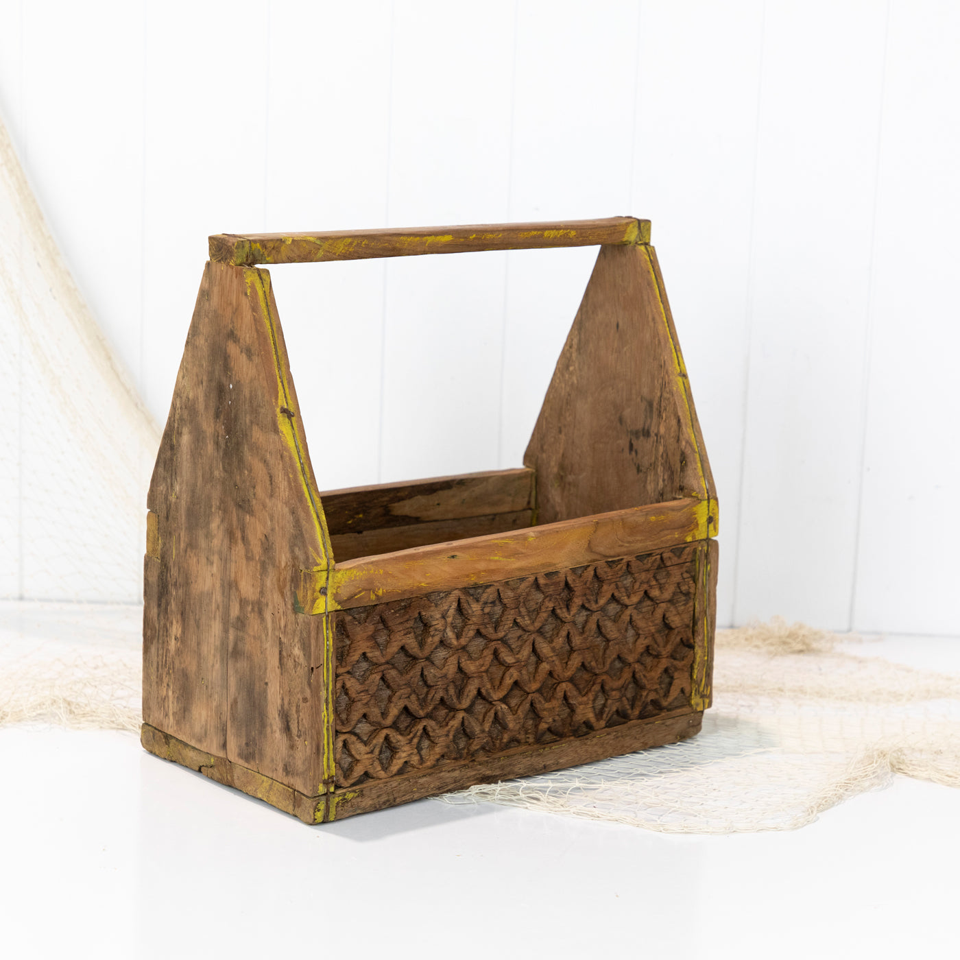 The side panels are carved in a lovely lattice pattern, and patches of yellow paint remain from a previous paint job!