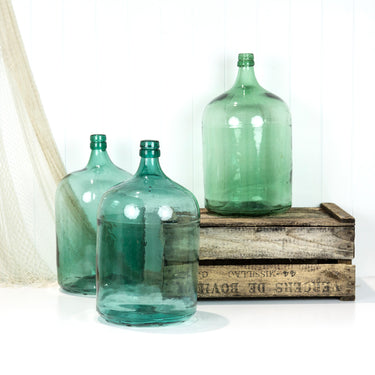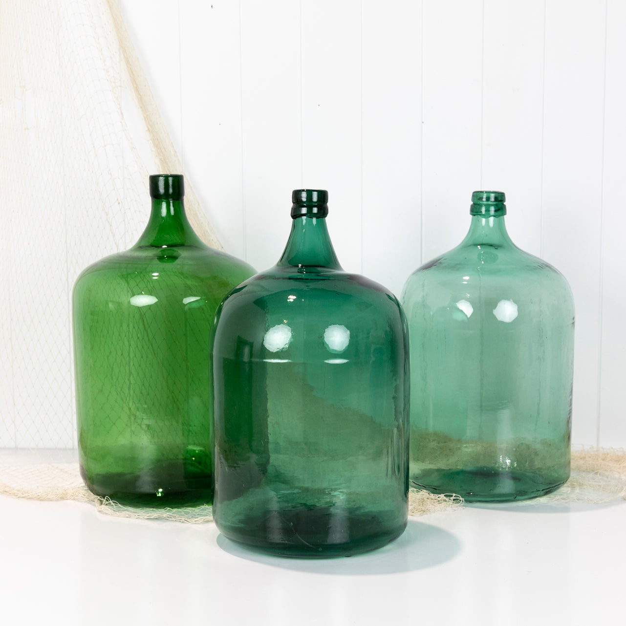 These wonderful old demijohns are in a spectrum of beautiful sea greens.
