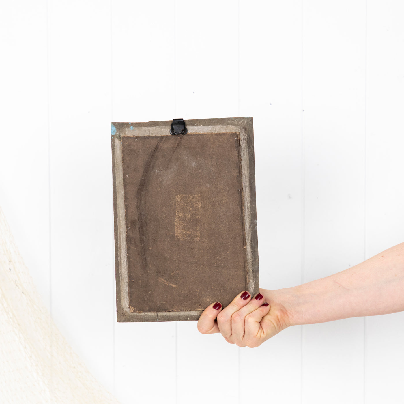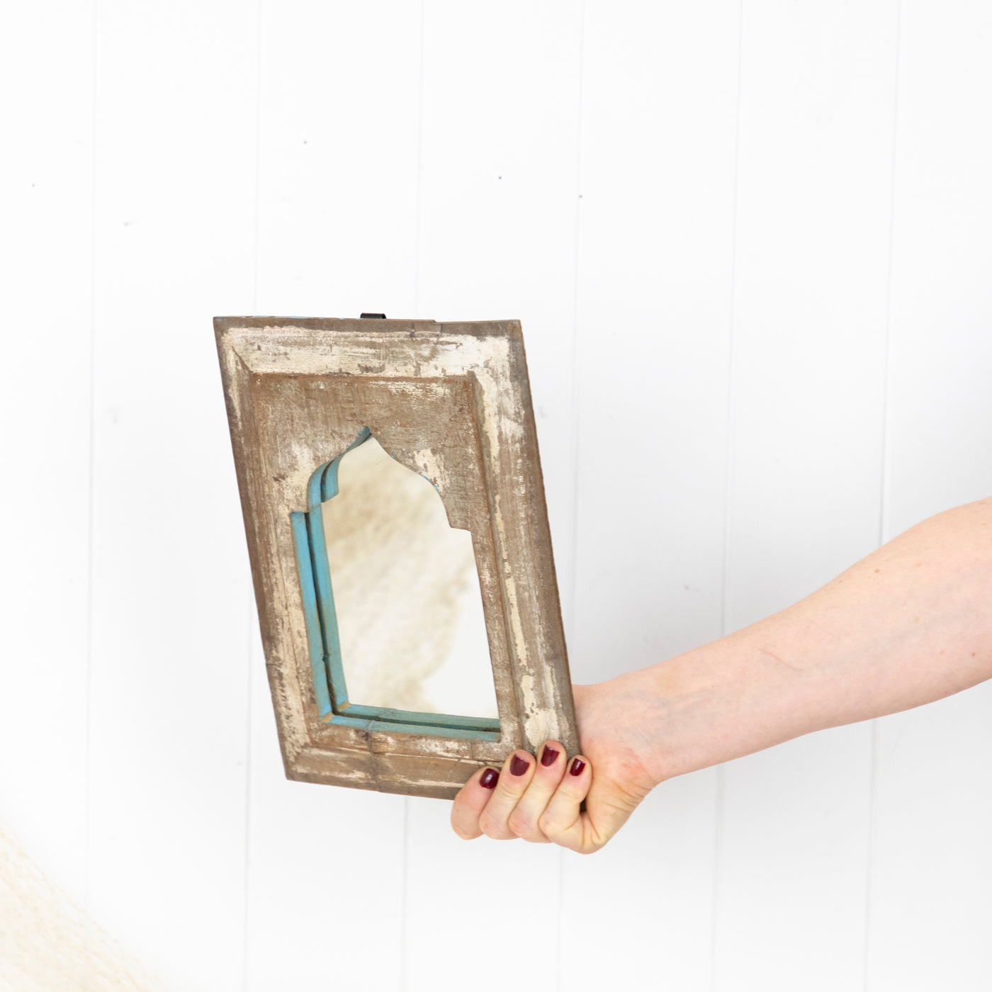 The timber is beautifully aged, with some remnants of past paint colours. Fitted with a hook ready to hang.