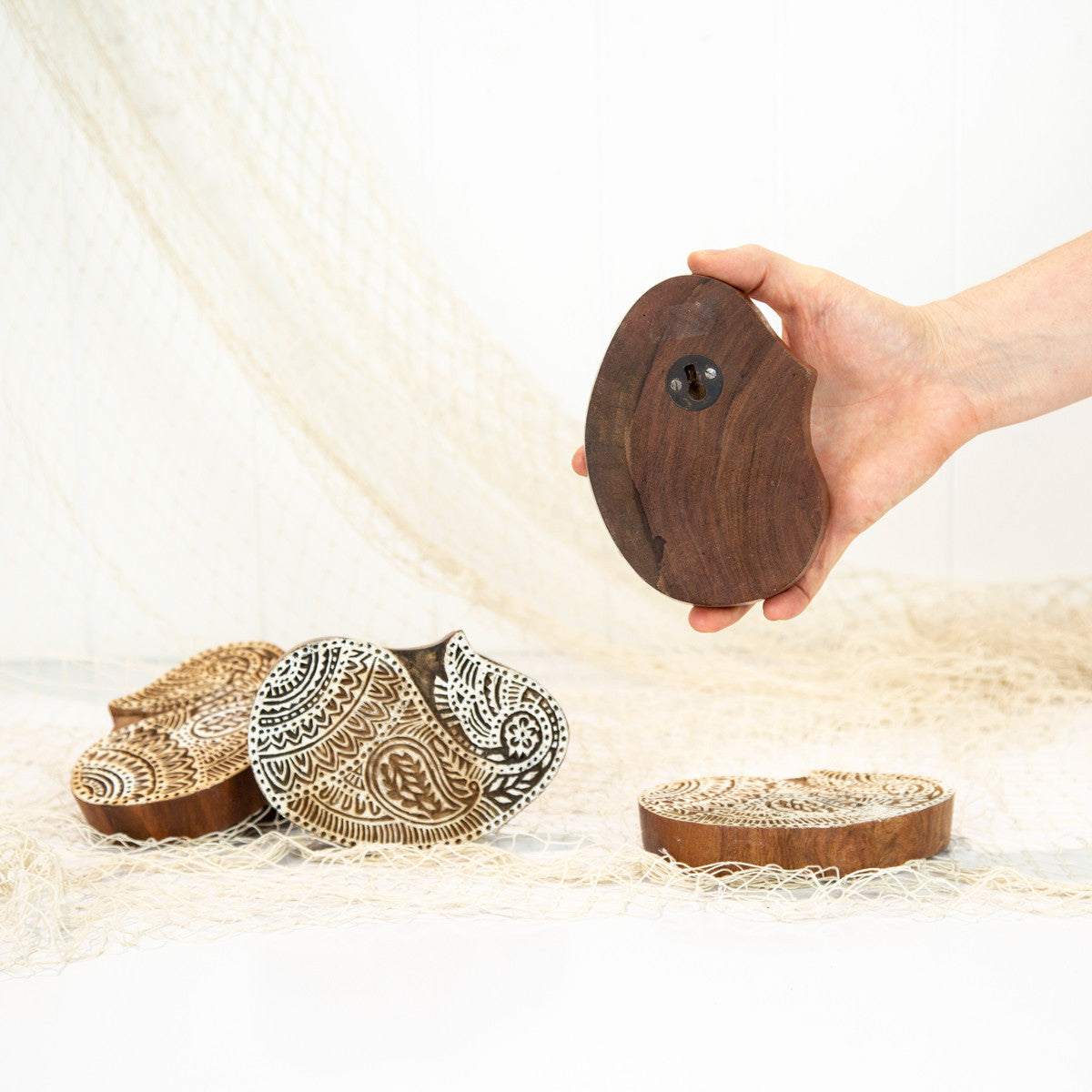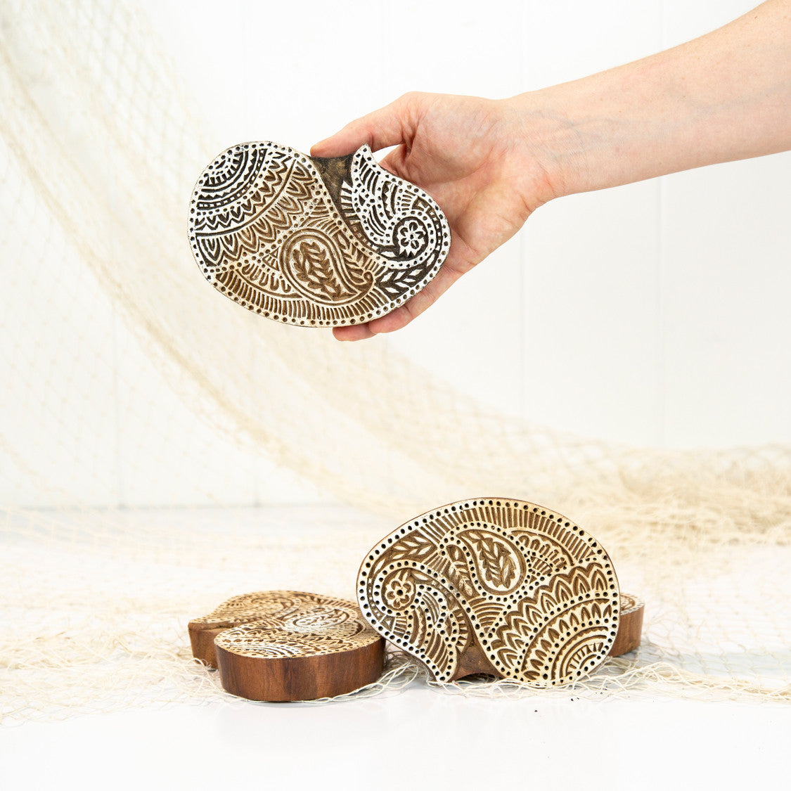 The sweet Indian printing blocks have been carved from timber, with the design highlighted in white.