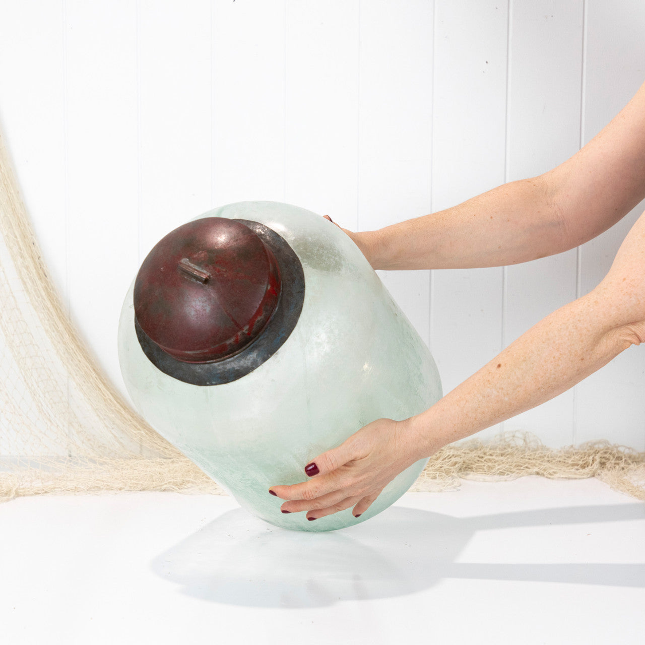 The old glass is frosted, and the lid is made from metal that has been painted red.